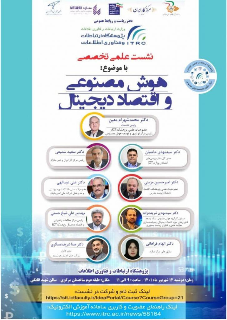 پنل تخصصی “هوش مصنوعی و اقتصاد دیجیتال” از سلسله پنل های تخصصی متاراد با مشارکت معاونت اجتماعی و پیشگیری از وقوع جرم قوه قضاییه، وزارت ارتباطات و فناوری اطلاعات، پژوهشگاه ارتباطات و فناوری اطلاعات، انجمن سیستم های هوشمند ایران و مرکز کار ایران، روز دوشنبه 14 شهریور 1401 در محل پژوهشگاه ارتباطات و فناوری اطلاعات برگزار شد.